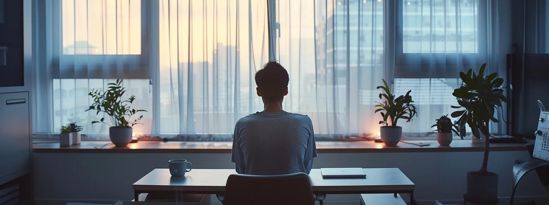 a serene office space features a lone individual sitting comfortably in front of a laptop, engaged in a brief meditation with soft lighting creating a calming atmosphere, symbolizing the practice of mindfulness to alleviate video meeting fatigue.