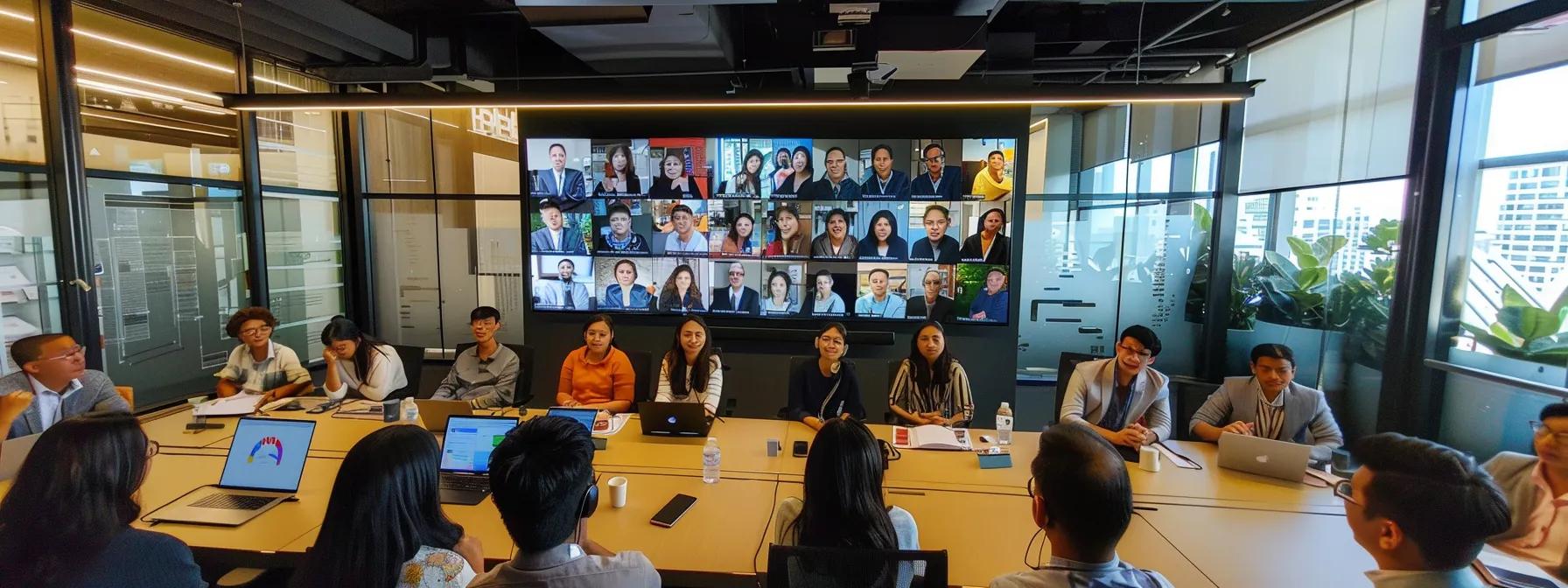 a modern office meeting room showcases a diverse group of professionals engaging in a video conference, with some team members opting for camera-off settings on their laptops, creating a relaxed and focused atmosphere enhanced by soft, diffused lighting and a minimalist design.