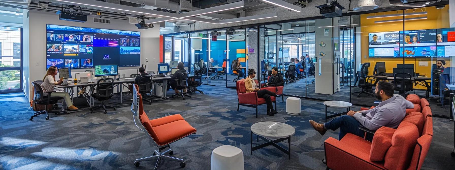 a vibrant, modern office setting captures a group of engaged professionals participating in a dynamic video meeting on large screens, with various interactive tools like virtual whiteboards displayed, illustrating an atmosphere of collaboration and focus.