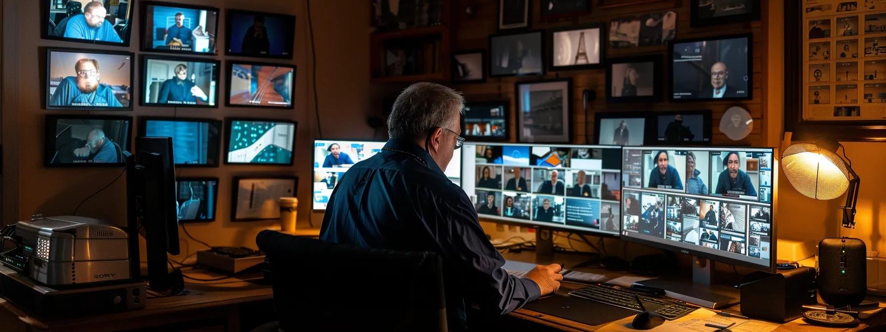 a weary professional sits at a cluttered desk, illuminated by the harsh glow of multiple screens displaying video conference participants, capturing the strain of maintaining focus amidst digital distractions in a modern office setting.