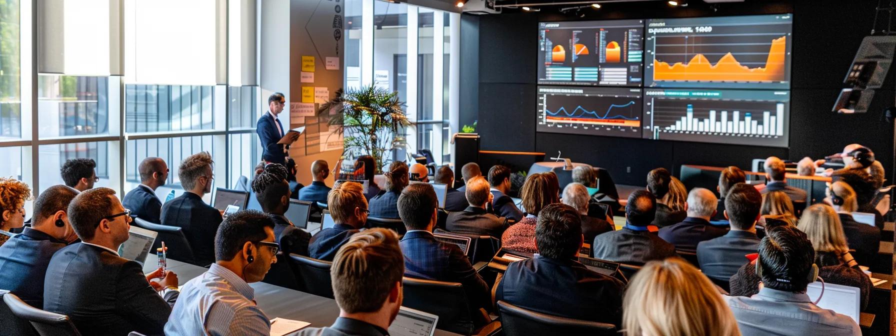 a sleek, modern office environment showcases a dynamic webinar presentation on a large screen, surrounded by digital dashboards displaying real-time analytics and integration metrics, capturing the essence of seamless marketing automation and data synchronization.