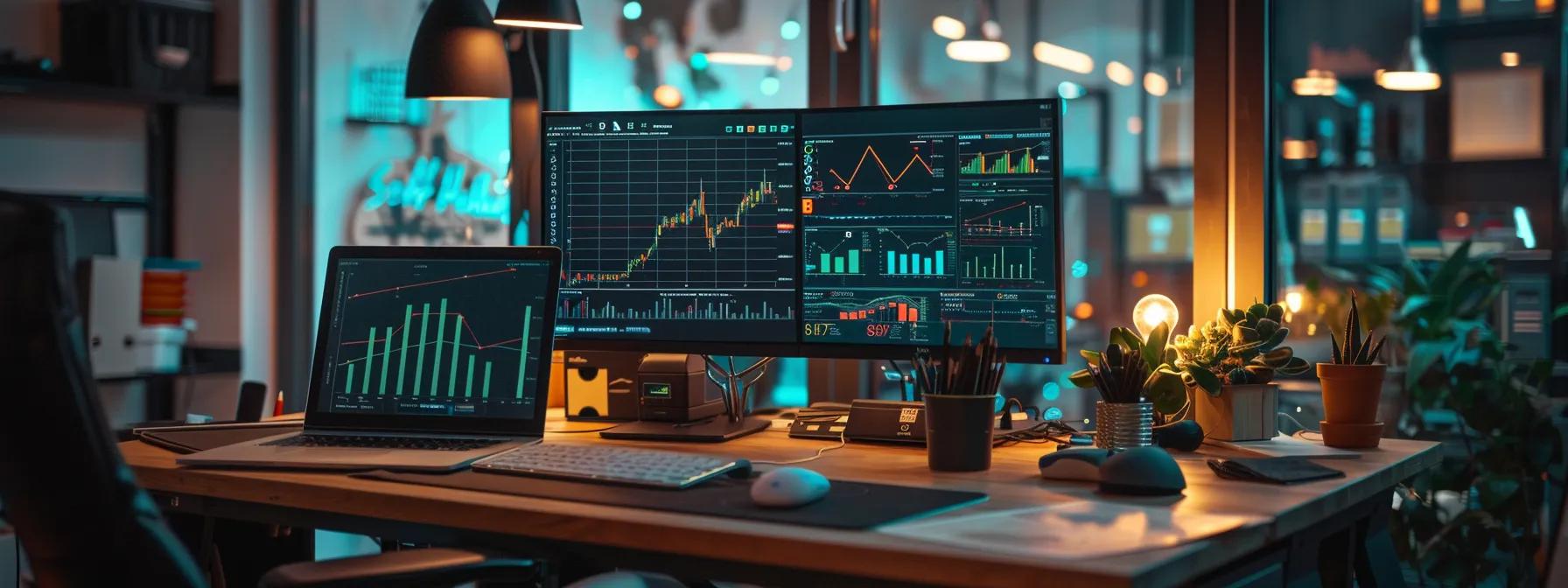 a modern office space featuring a sleek computer setup displaying a comprehensive marketing dashboard, with vibrant graphs and data visualizations that illustrate the integration of webinar platforms and automation tools for optimizing marketing performance.