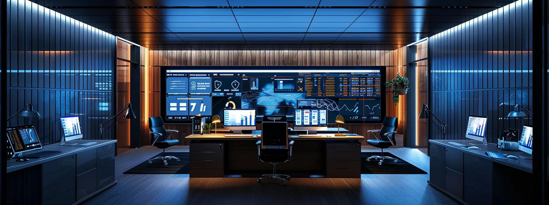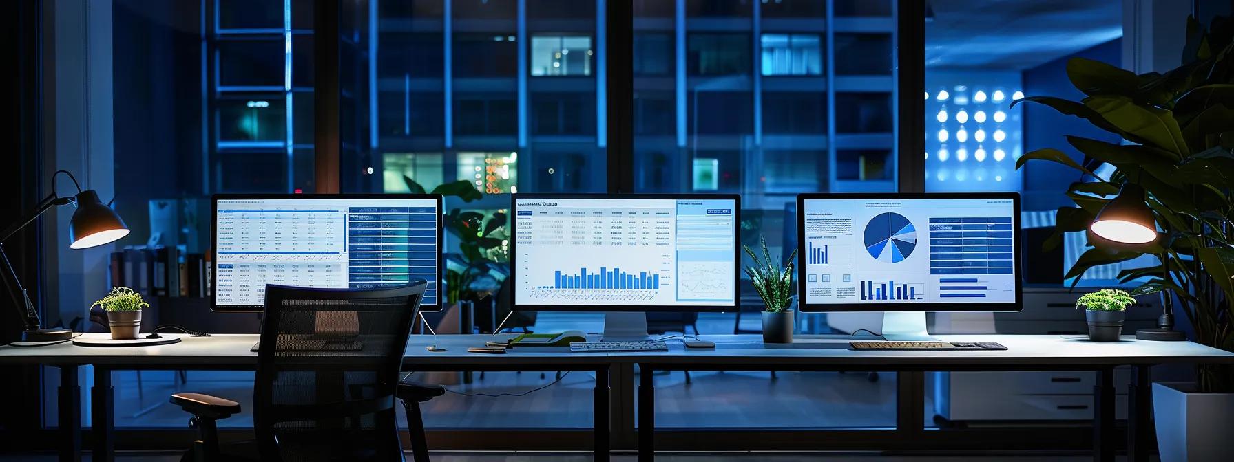 a sleek, modern office workspace with multiple computer screens displaying a dynamic webinar platform comparison chart, showcasing key features and integration capabilities, illuminated by focused overhead lighting to create an engaging and professional atmosphere.
