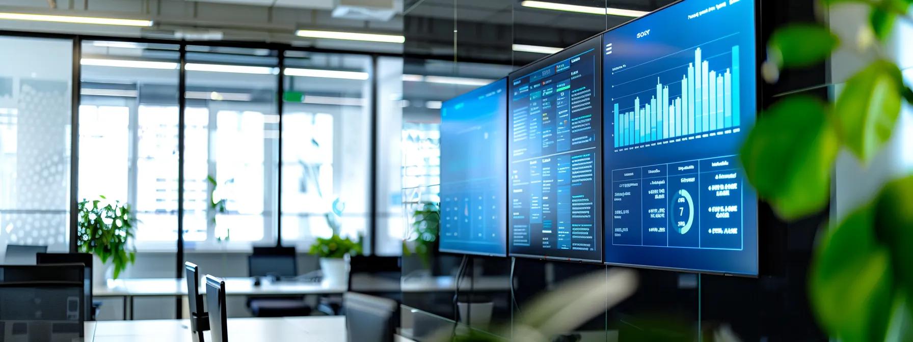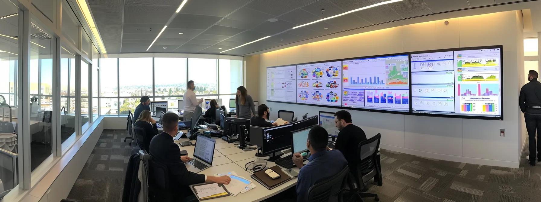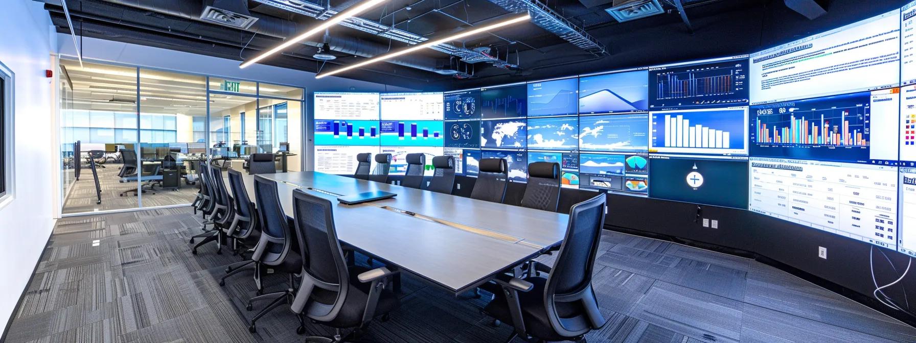a sleek, modern office environment features a large conference table with digital screens displaying data analytics, marketing software interfaces, and flowcharts, highlighting a collaborative team discussion focused on optimizing marketing infrastructure and integration strategies.