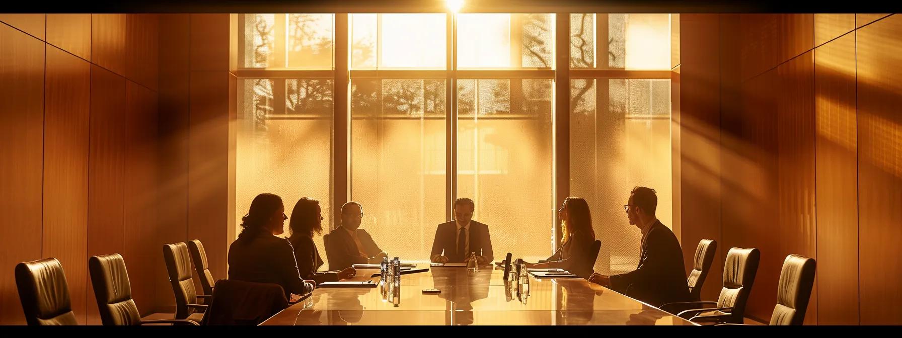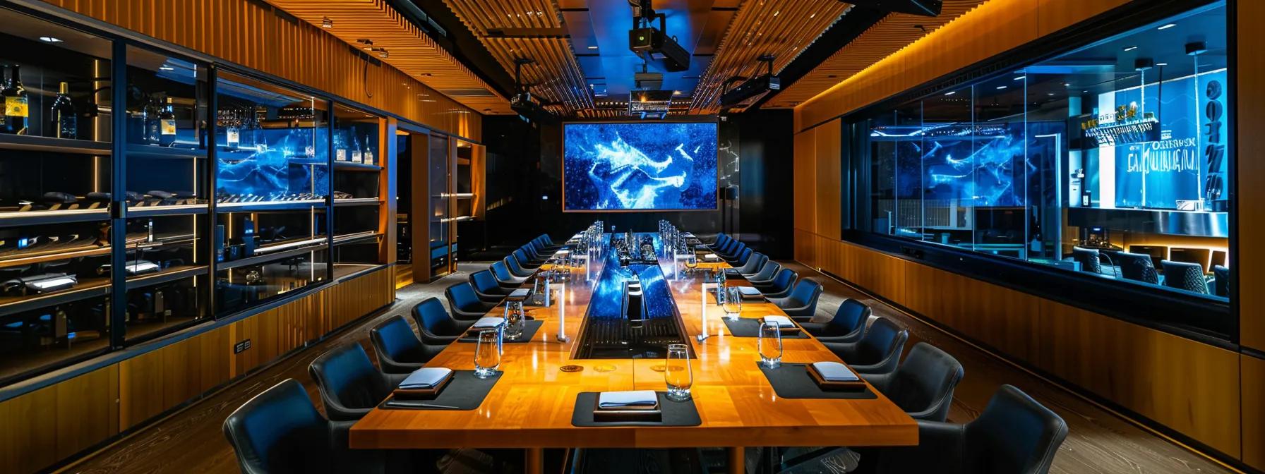 a sleek boardroom filled with modern technology showcases a high-definition video conferencing setup, where executives engage in a dynamic discussion, illuminated by strategic lighting that emphasizes the professionalism and efficiency of virtual collaboration.